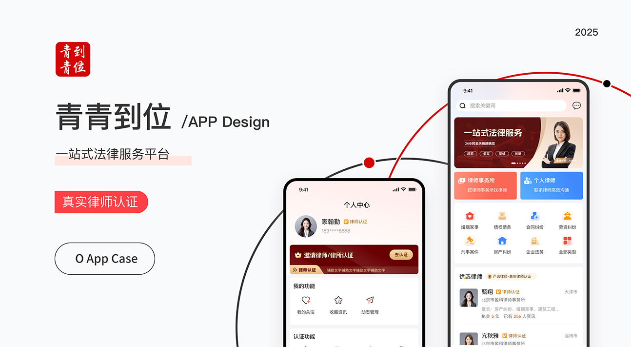 “青青到位”APP以红白简约设计,彰显法律服务的专业与可靠。左侧醒目展示“一站式法律服务平台”与“真实律师认证”核心承诺。右侧双屏清晰呈现个人中心与首页界面,律师信息一目了然。整体设计简洁直观,致力于为用户提供高效、可信赖的触手可及的法律服务。