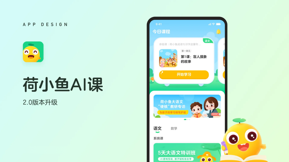 以清新活泼的视觉设计亮相,界面清晰展示“今日课程”、“语文数学系统课”及“5天大语文特训班”等核心内容,搭配生动的黄色卡通形象,营造出轻松愉悦的学习氛围。整体设计简洁直观,让孩子在快乐中有效学习。