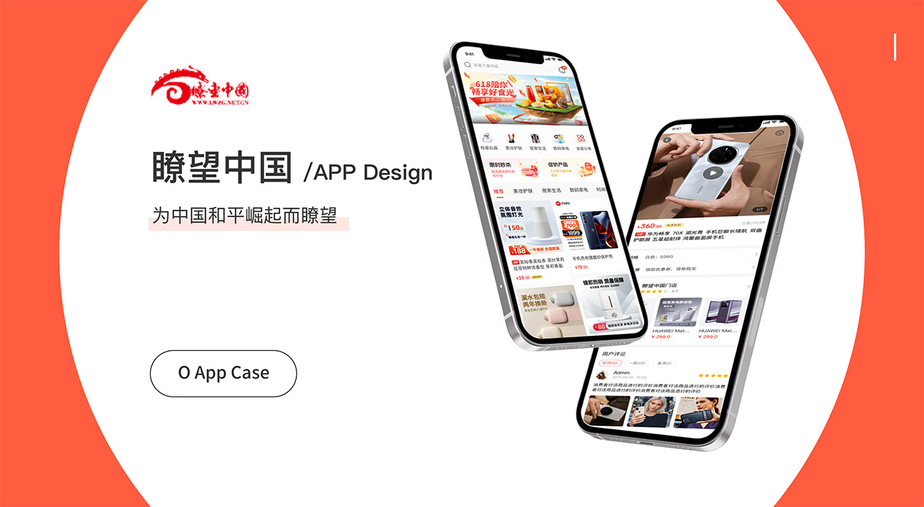 “瞭望中国”APP界面设计以橙红色为视觉焦点,搭载“为中国和平崛起而瞭望”的鲜明主张。双屏展示清晰呈现新闻资讯与相关服务,整体布局简洁大气,色彩对比强烈,在直观传递信息的同时,亦凸显出沉稳、前瞻的品牌气质。